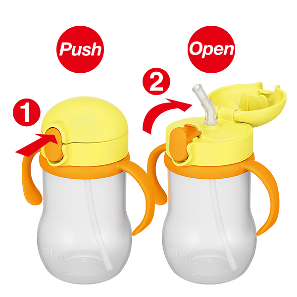 携帯用魔法びんを数多く開発してきたサーモスの技術を生かし、カチッと閉まってもれないので、持ち運びにも安心です。お子様の小さな手でも持ちやすいハンドル付き。ボトル本体は目盛付きで飲んだ量が分かりやすく、キャップ、本体容器、ハンドル、ストローなどは取り外して洗浄でき衛生的です。キャップはワンタッチ・オープンの簡単操作。フタを開けたとき、飲料が飛び散りにくいストローを採用しました。