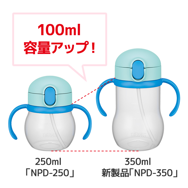 新製品の「サーモス ベビーストローマグ(NPD-350)」は、2016年3月に発売した「ベビーストローマグ(NPD-250 ※250ml)」の大容量タイプです。250mlでは容量が足りないというお子様を持つ方の声に応え、大容量タイプを開発いたしました。
