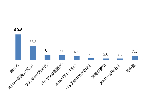 ベビー用ストローマグの使用者を対象に行ったWEB調査「ベビー用のストローマグに最も求めること」では66.3%の方が「もれないこと」を挙げており、洗いやすさや価格、ハンドル付きなどの項目を大きく上回りました。同調査で40.8%の方がベビー用ストローマグに対する不満を「もれること」と回答しています。非常に多くのお母様方がベビー用ストローマグの「もれ」への不満を持ち、もれない製品を求めていることが分かりました。そこで、もれない機能性に加え、ハンドルの取り外しができ洗いやすい製品の発売に至りました。