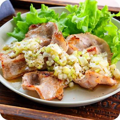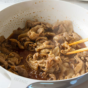 - 同じフライパンに油小さじ2を足して中火で熱し、豚肉を炒める。火が通ったら●を加えて煮からめる。