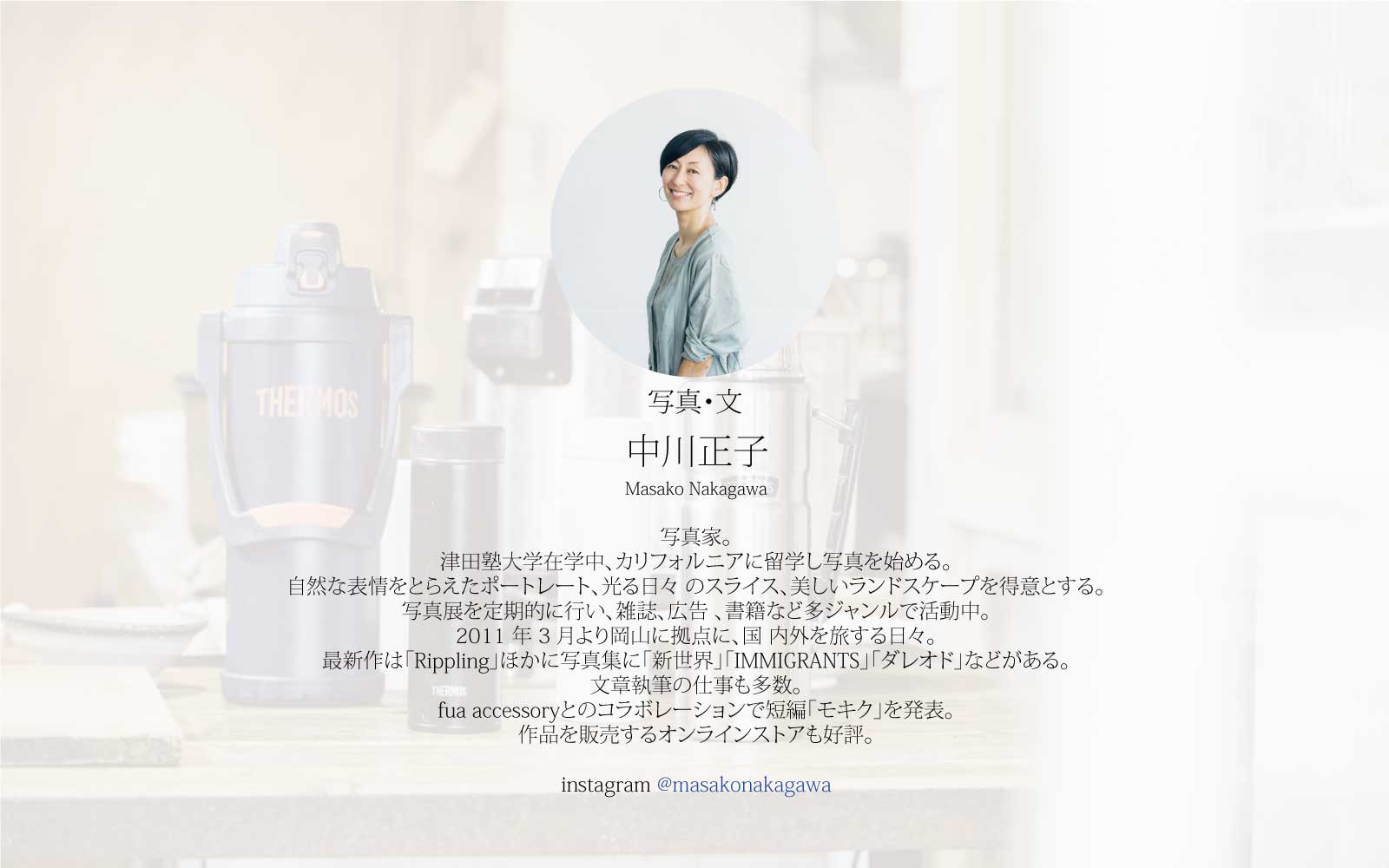 津田塾大学在学中、カリフォルニアに留学し写真を始める。自然な表情をとらえたポートレート、光る日々 のスライス、美しいランドスケープを得意とする。写真展を定期的に行い、雑誌、広告 、書籍など多ジャンルで活動中。2011年3月より岡山に拠点に、国 内外を旅する日々。最新作は「Rippling」ほかに写真集に「新世界」「IMMIGRANTS」「ダレオド」などがある。文章執筆の仕事も多数。fua accessoryとのコラボレーションで短編「モキク」を発表。作品を販売するオンラインストアも好評。
