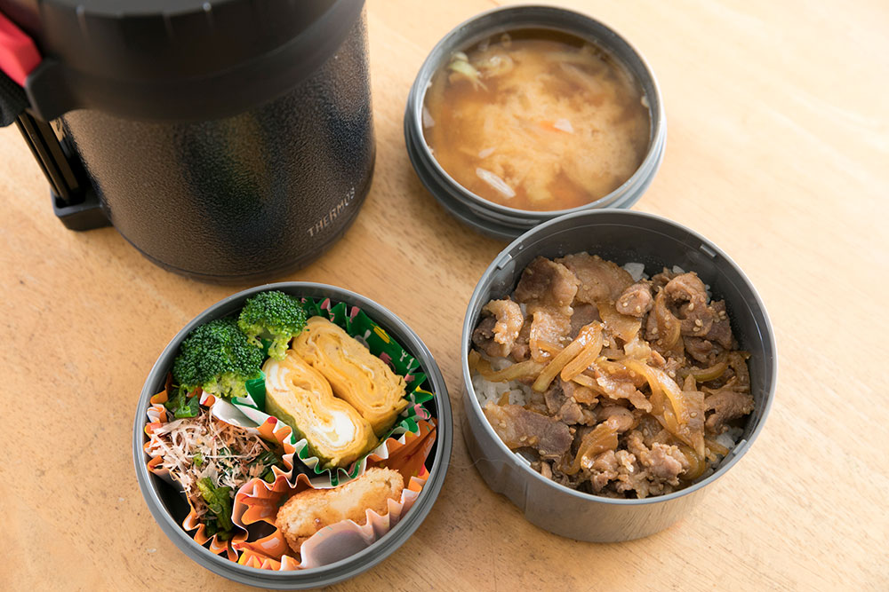 海に入ると身体が芯から冷えます。冬はもちろんですが、夏でも早朝は冷えることも。だから一年通して、食事には温かいスープが欠かせません。休日の練習時や大会の朝に持たせるお弁当にもオニオンスープや味噌汁をつけます。お弁当の中身はなんてことないものなのですが、遠征先ではコンビニご飯になることが多いので、できるときには手料理を食べさせたくて。1.3リットルのお弁当箱ですが、サーフィンは運動量もあるので完食してくれます。