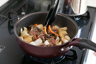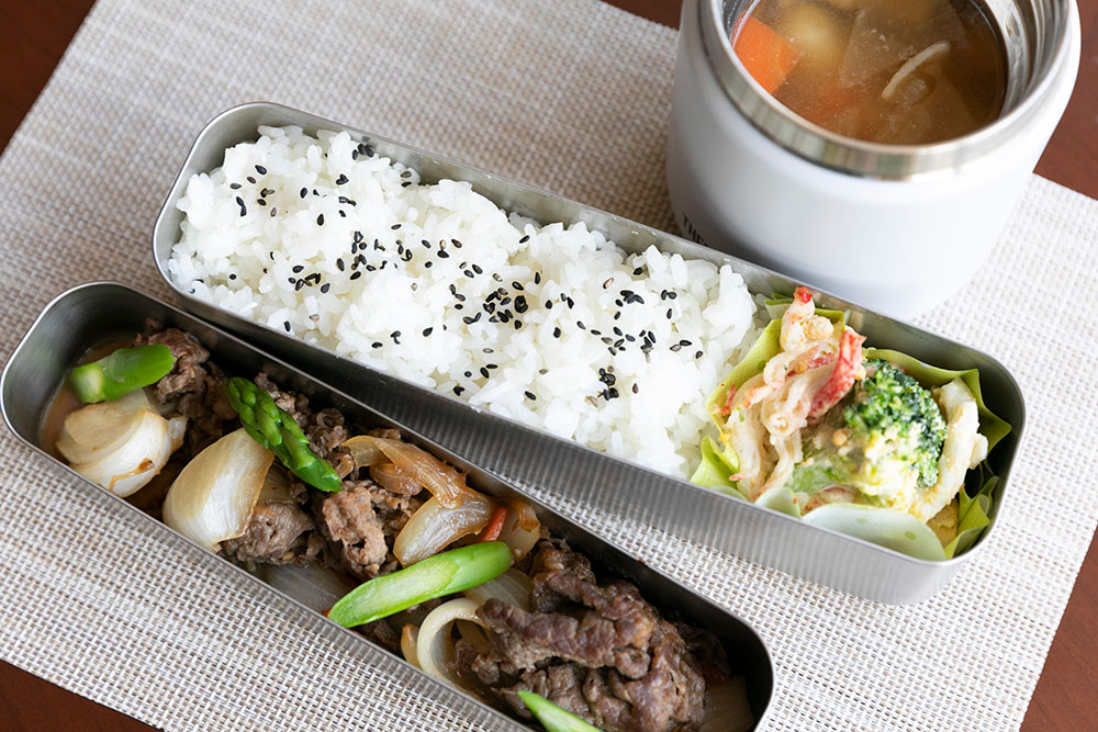特に意識しているのは体をつくるタンパク質と、貧血予防のため鉄分を摂取すること。お弁当だとごはんの量を200g以上はとらせたいと思っています。資起はお肉が好きで、野菜だけのおかずだと箸をつけてくれないこともあるので、お肉の上に旬の野菜を炒めてのせたりして、自然と栄養バランスが整うように工夫しています。味付けも変わったものにすると嫌がるので、焼肉のたれのようなご飯が進むベーシックな味付けで。いわゆる“男飯”です。