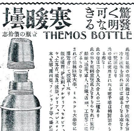 サーモス社製の魔法びんが日本にやってきたのは、明治時代のことでした。1908年(明治41年)の新聞広告では、「驚くべき発明なる寒暖壜(=びん)」と表記して、ドイツ サーモス社製の魔法びんを紹介しています。