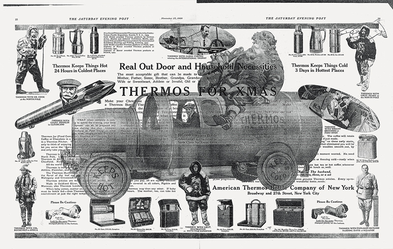 例えば1909年、米国で展開された全米を巡回する宣伝車「サーモスカー」によるクリスマスキャンペーン広告は、当時の政治家や冒険家など、サーモス製品の愛用者をコラージュで紹介しています。サーモス製品は日本でもお馴染みの第26代アメリカ合衆国大統領のセオドア・ルーズベルトをはじめとし、第27代大統領のウイリアム・タフトもホワイトハウスで愛用していたと記録されています。