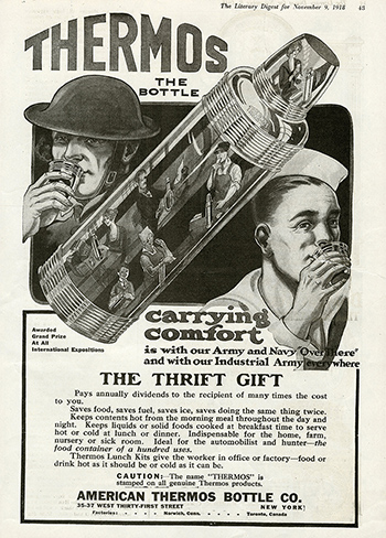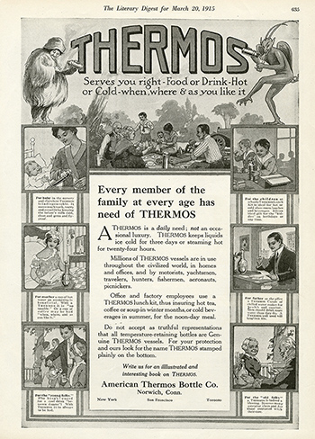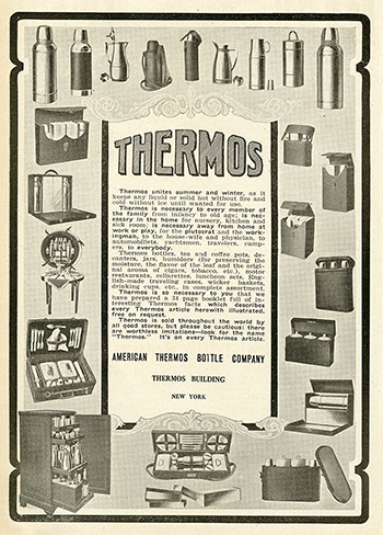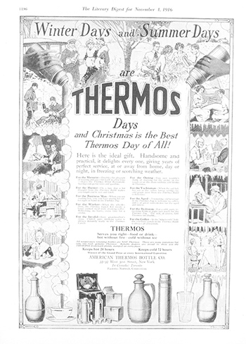 広告のイラストでは海や山、ゴルフ場でのレジャーシーンが印象的に描かれ、当時のアメリカの豊かな暮らしぶりがうかがえます。1910年代は、ボトルや携帯用のケースなど製品ラインアップも急速に増え、ライフスタイルが豊かになって多様化し、同時にサーモスも大きく発展した時代でした。