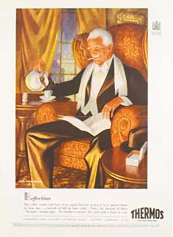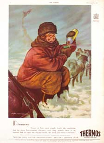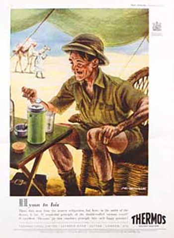 砂漠のテントで休憩する冒険家、自宅で夜のコーヒーを楽しんでいる英国紳士、極寒の地に向かう探検家が描かれたイラストで、サーモス製品の実力をアピールしました。1930年代の広告と同様、英国王室のマークが右上に記されています。