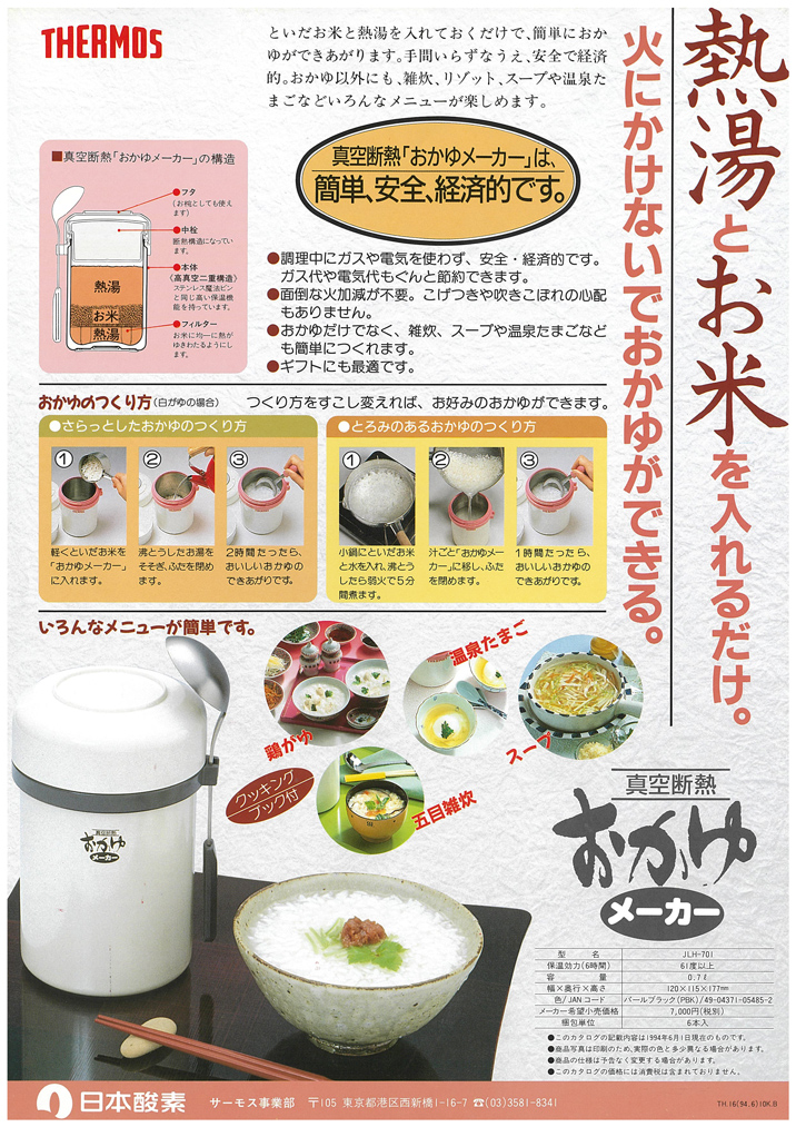 その仕組みは、調理鍋で調理したあとに、魔法びん構造の保温容器に入れて、余熱で調理を進めるというものでした。