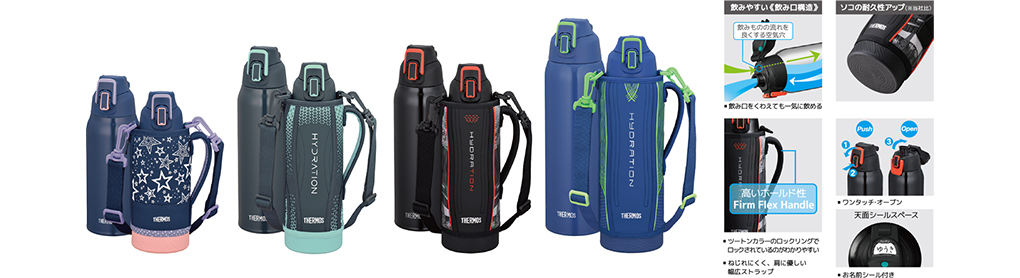 その後も、より洗いやすさを向上させたャップユニット、ボディをガードするカバーやポーチの採用など、スポーツボトルはたゆまぬ進化を遂げ、様々なシーン・用途に応じた新製品の投入を行ってきました。