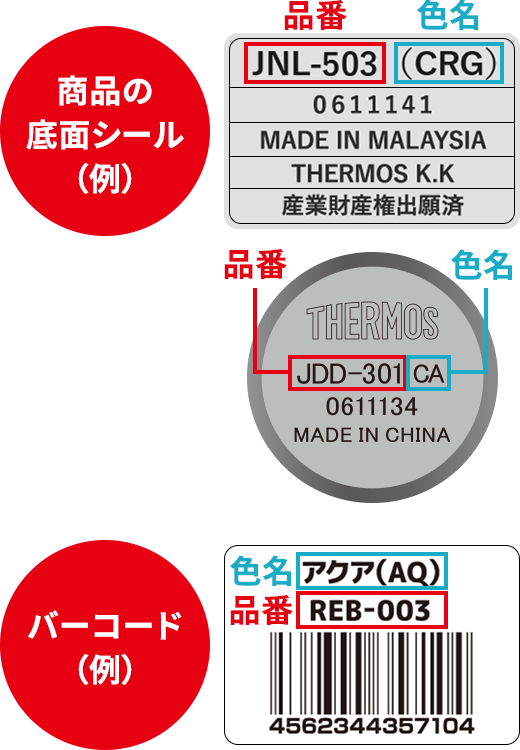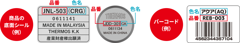 製品の品番・色名はご購入いただいた商品の底面シールや、商品パッケージのJANコード付近に記載されております。