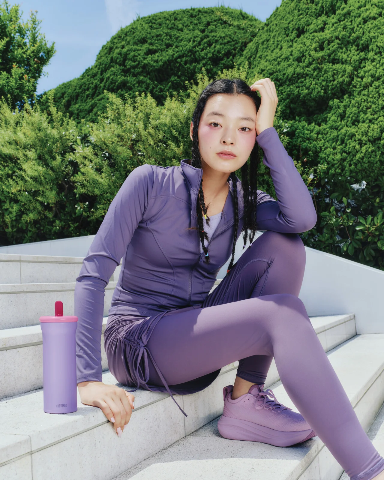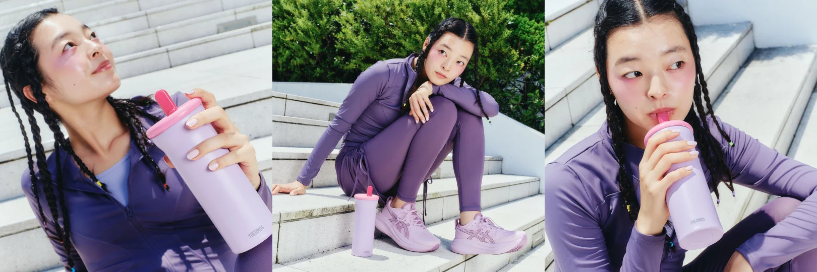 クールなパープルと甘いピンクの組み合わせが個性を引き立てる。