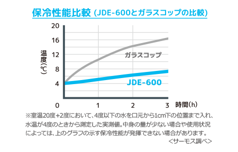 ステンレス製魔法びん構造で、中に入れた飲みものの温かさや冷たさをキープするだけでなく、持った時に、外側に熱さ・冷たさが伝わりにくく、氷を入れても結露しないのが特徴です。保冷性能も一般的なガラスコップに比べて高く、当社が行った実証試験で、6時間後でも氷が長持ちするという結果が得られています。(室温20度±2度において、4度の冷水+氷を入れた実証試験。サーモス調べ。本リリース下記参照)