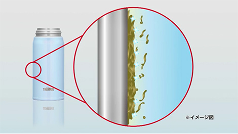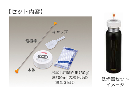 「サーモス マイボトル洗浄器」は、洗浄器本体をボトルの口元に置き、ボトル内部の金属部分に電流を流すことで、ボトルと汚れの間で化学反応(ラジカル反応)を起こして汚れを根元から剥がす、新しいタイプのステンレスボトル用洗浄器です。