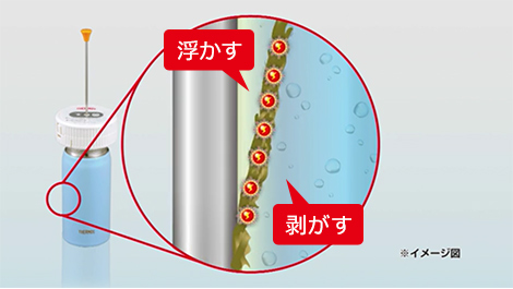 ボトル内部の金属部分に電流を流すことで、ボトルと汚れの<間>で化学反応(ラジカル反応)を起こし、汚れを根元から浮かせて剥がす