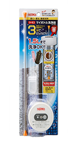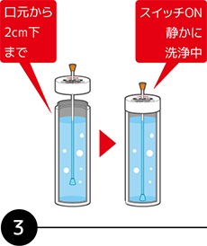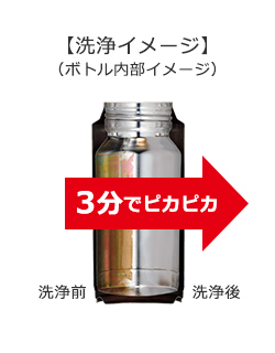 一般的な酸素系漂白剤は、汚れの表面を溶かしながら落としていきますが、マイボトル洗浄器を使用した場合、ボトルと汚れの接着面に作用するので、専用漂白剤を入れ洗浄器をセットしスイッチを入れたら3分で洗浄終了。あとは水洗いや、スポンジで軽くこするだけで、ピカピカのボトルに!