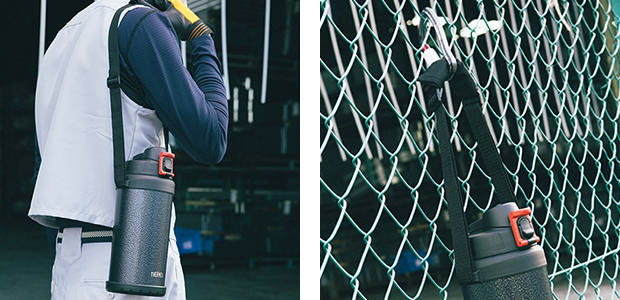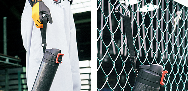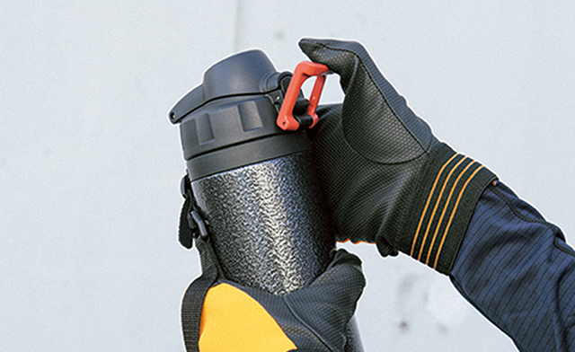建設現場では、保冷力の高さからサーモスがスポーツユーザー向けに発売している「真空断熱スポーツボトル、スポーツジャグ」をお使いの方を多く見受けます。そこで、建設業界向けに本シリーズを開発。実際に建設現場で働く人々にヒアリングを実施しました。保冷力が高いもの、持ち運びやすく、直置きではなく引っ掛けられるもの、容量は1~2Lの大容量で途中で補充できるもの、汚れや衝撃に強いもの、そして、ヘルメットや軍手をしたままでも簡単に使用できるもの、などの要望があることが分かり、様々な工夫を施した製品を開発いたしました。