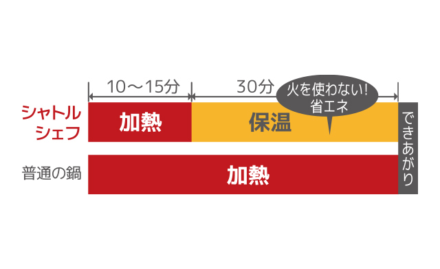 保温調理とは、短時間火にかけた後に保温し、余熱のチカラで食材に火を通す調理方法。調理に関わる時間とエネルギーが節約できる上、煮崩れなく素材本来の旨味を生かします。忙しい現代だからこそ、時間を節約できる「保温調理」が便利です。