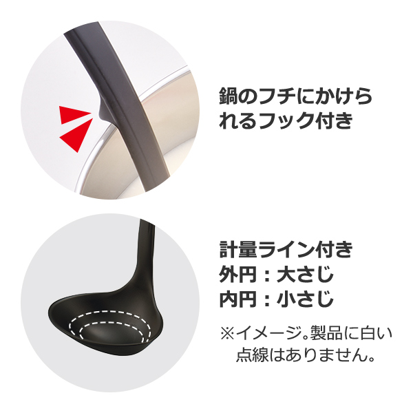 『サーモス スープジャー用おたま(APE-001)』は、スープジャーをより便利に使っていただきたいと、スープジャーへの注ぎやすさを検討して開発した、両サイドから注げる新製品。大さじ・小さじの計量ラインや、鍋のフチにかけられるフック付きで食洗機OKだから、お弁当の準備だけではなく、普段の調理でも便利にお使いいただけます。