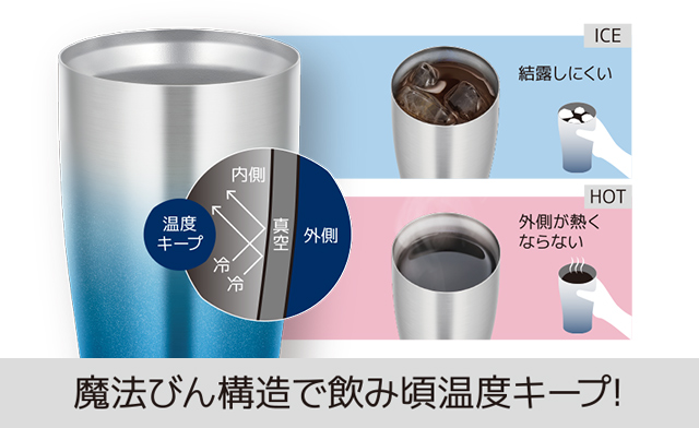 真空断熱タンブラーは、真空断熱構造で飲み頃温度を長時間キープし、温かい飲料を入れても外側が熱くならず、冷たい飲料では結露しにくく快適にご使用いただけます。