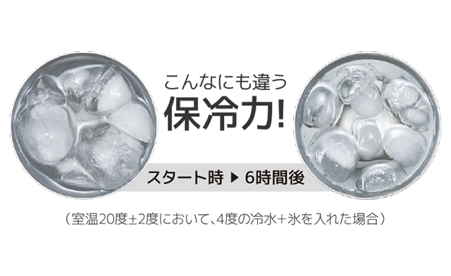 ※1ステンレス製魔法びん構造(真空断熱構造)は、中に入れた飲みものの温かさや冷たさをキープするだけでなく、持った時に、外側に熱さ・冷たさが伝わりにくく、氷を入れても結露しにくいのが特徴です。保冷性能も一般的なガラスコップに比べて高く、当社が行った実証試験で、6時間後でも氷が長持ちするという結果が得られています。(室温20度±2度において、4度の冷水+氷を入れた実証試験。サーモス調べ。)