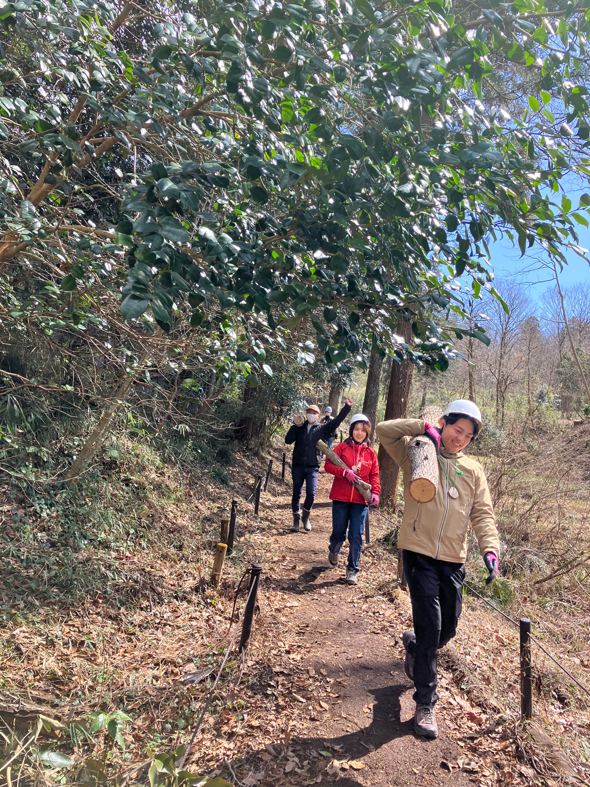 里山で伐採後に乾燥させていた木材を再利用するために運びました。