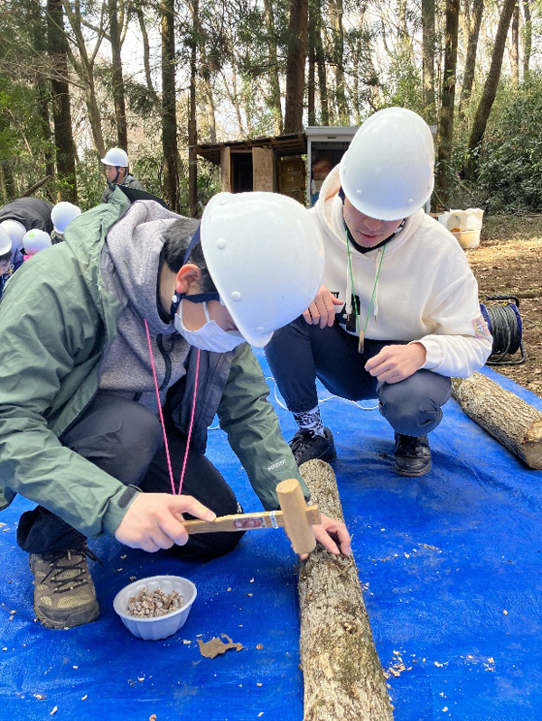 伐採乾燥後の木材を利用してシイタケの植菌を行いました。