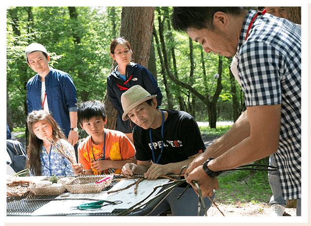 13時より、アウトドアプロデューサーの長谷部雅一さんによる「自然素材のつるかご編みワークショップ」を開催。長谷部さんがあらかじめ用意したつるを使い制作。皆さん試行錯誤しながら思い思いの形のつるかごを編み上げました。