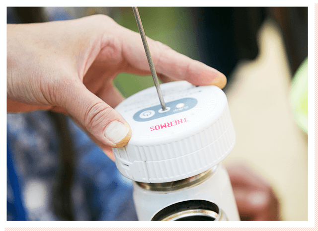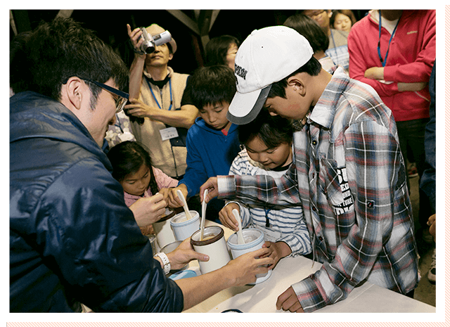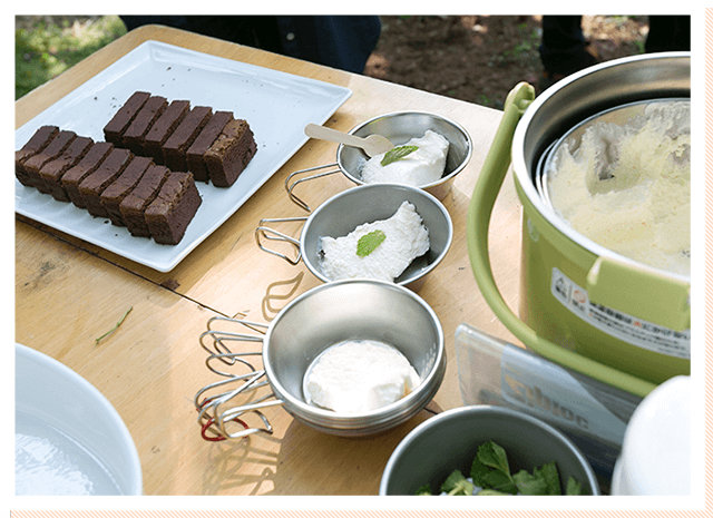 食後といえばスウィーツ!サーモススタッフと一緒にサーモスの「真空断熱アイスクリームメーカー」でアイスクリーム作りにも挑戦しました。みなさん、アイスクリームが固まっていく様子に興味津々。