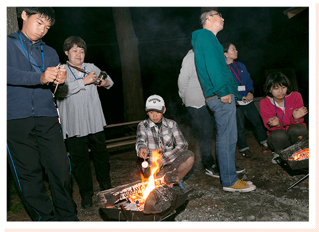 たき火の周りに集まり談笑しながら親睦を深め、夜は更けていきました。