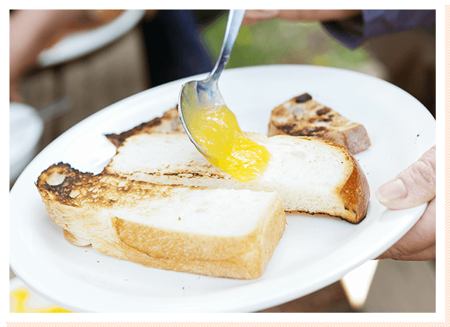 炭火で食パンを焼き、昨日作ったレモンカードをかけたら出来上がり。