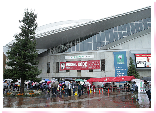 当日はあいにくの雨模様ながら、ノエビアスタジアムは開閉式の屋根を持つ、全天候型スタジアムなのでノープロブレム!ゴール裏に陣取ったヴィッセルサポーターの歓声が飛び交う中、関係者しか入れないピッチ周りを全員で見学。初心者でもわかりやすいように、各種座席から見るサッカー観戦の特徴を解説していただきました。
