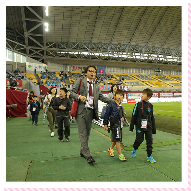 今回のイベントは、多数の応募の中から、見事当選した16組の親子が参加。関係者用の専用パスが手渡され、関係者入口からいざ会場へ!普段は入れない通路を通り、子どもたちも緊張の面持ちです。