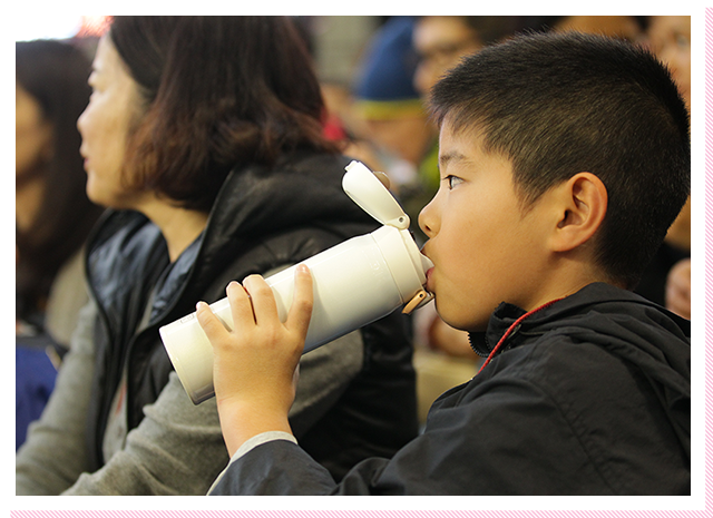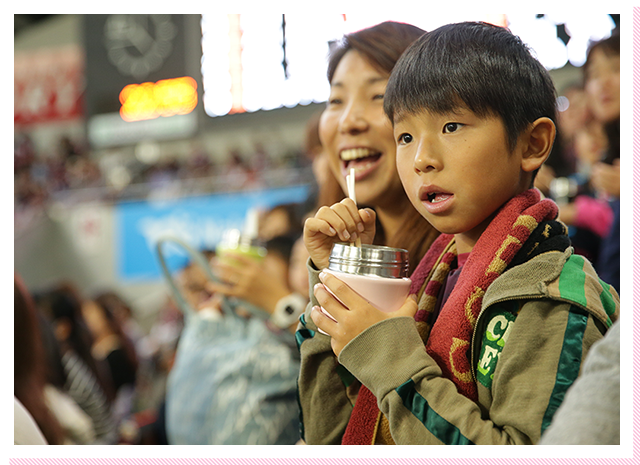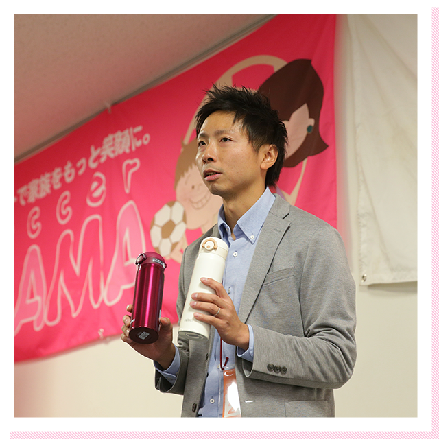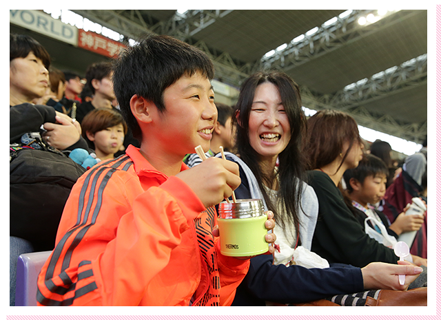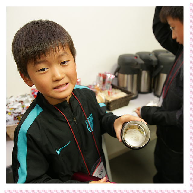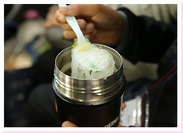 第1部で紹介したスープジャーにはスープ春雨を、ケータイマグにはホットコーヒーを入れて、試合観戦をしながら味わってもらいました。スープ春雨を試したキッズからは「アツアツのまま、美味しい!」、コーヒーを飲んだママからは「冷めてない!」「軽い!」といった声が上がりました。