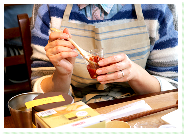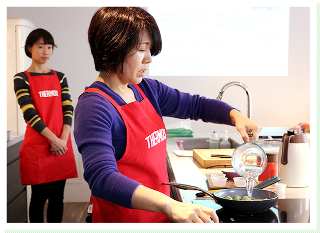 早速、スープジャーを使った「青菜の和風おかゆ」作りを、参加者の皆さんに体験していただきました。