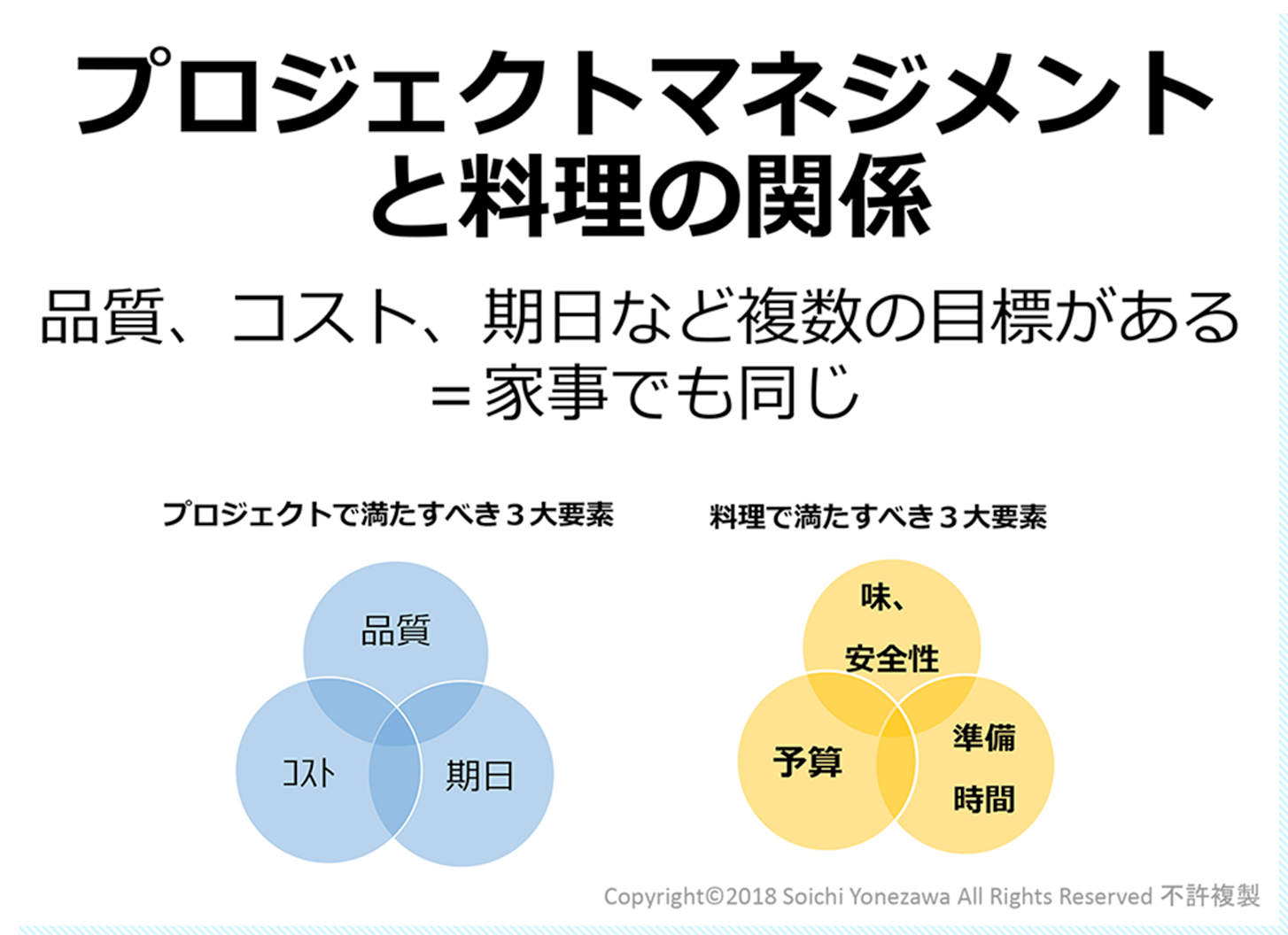 まず、プロジェクトには「品質」「コスト」「納期」という満たすべき3つの目標がありますが、料理も同様に、「味、安全性」「予算」「準備時間」の3つを満たさなければなりません。