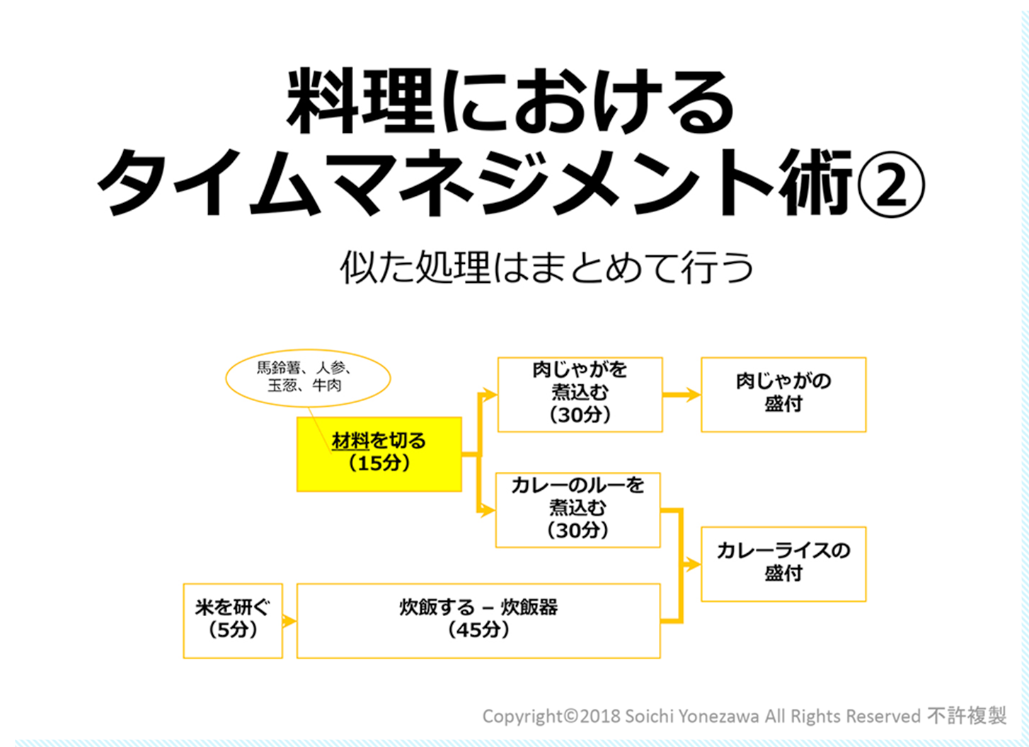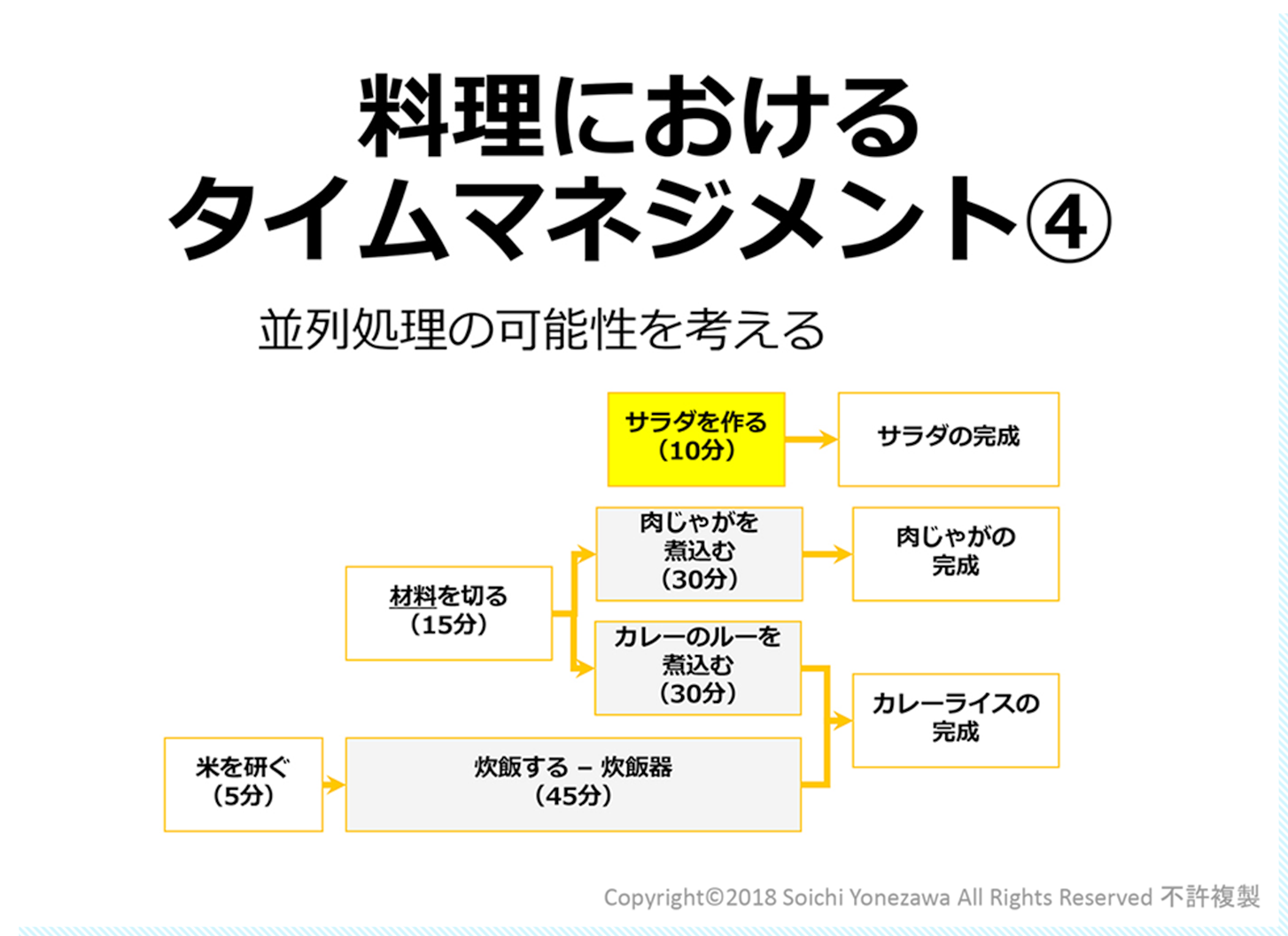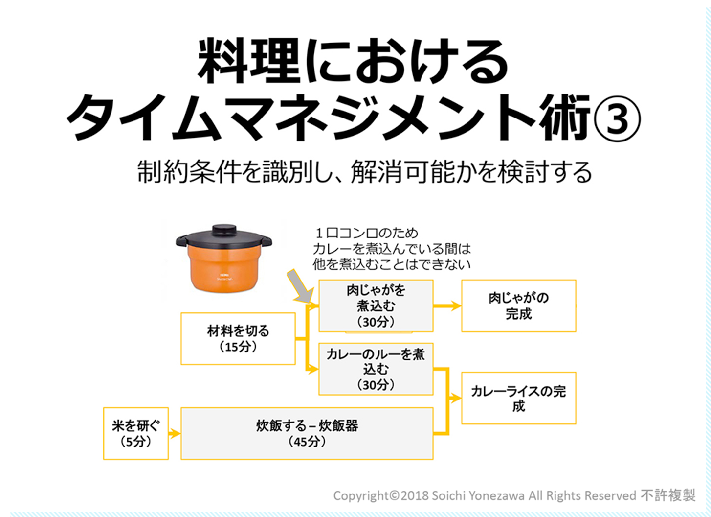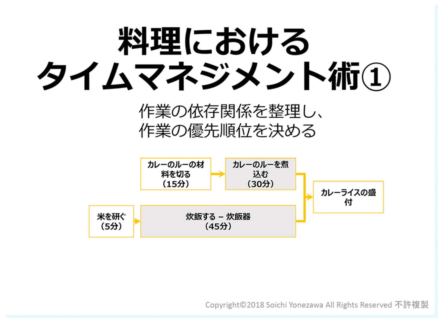 例えばカレーを作る場合、米を研ぐことと、炊飯の間には明確な依存関係があり、カレーの材料を切ることと、それらを煮込むことの間にも明確な依存関係があります。米を研ぐことと材料を切ることは同時にできません。なぜなら、料理人が一人であるという制約条件と、それぞれの仕事がつきっきりにならければいけないというプロセスの特性があるからです。まず取りかかるのは米を研ぐこと。材料を切って炒め、煮込むことは、炊飯中にできます。カレー以外の料理でも、まずは作業の優先順位を決めなければなりません。