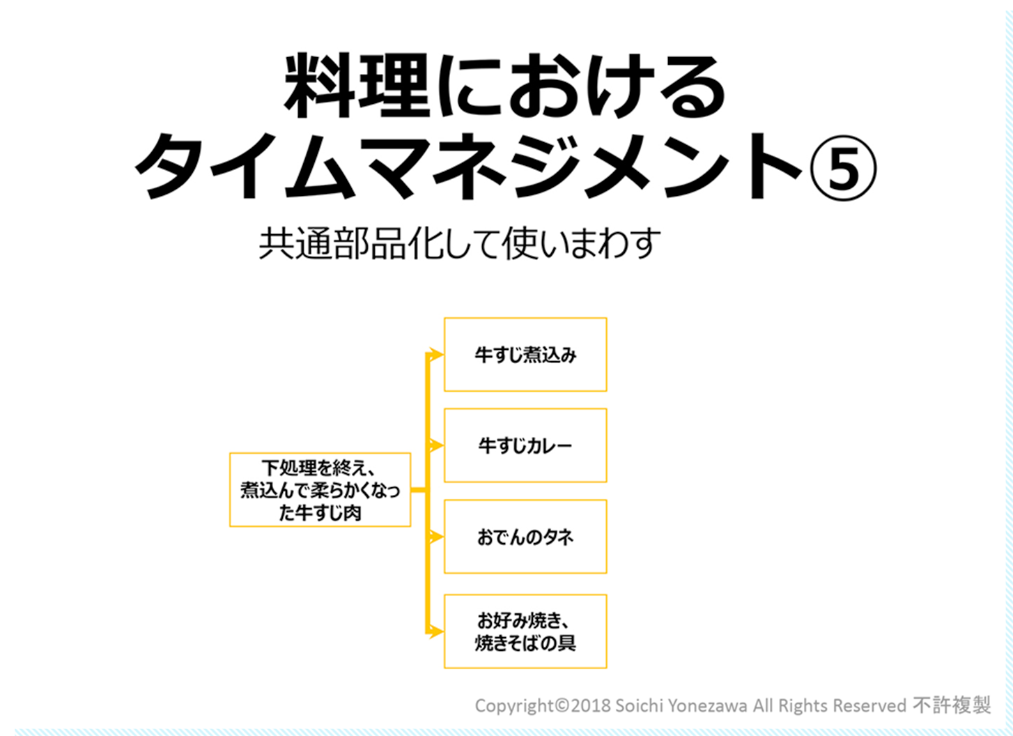 また料理のタイムマネジメントについて次の5つのポイントを示されました。タイムマネジメントとはプロジェクトマネジメントのひとつの要素であり、やるべきことを時間の観点で最も効率的に行えるようにすることが重要だそうです。