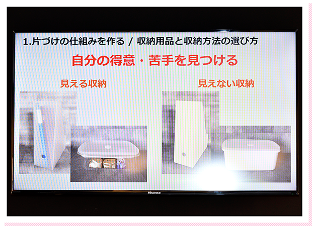 まずは、片付けの基本となる「片付けの仕組み」について。モノを出して見直す、自分の得意な収納を見分けるコツなどを教えていただきました。