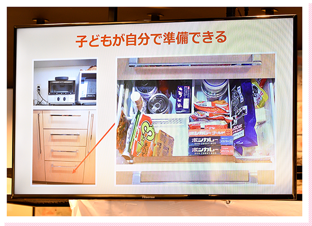 高橋さんの自宅のキッチン収納の様子を踏まえ、子どもが自分で準備できるための収納方法や、見つけやすく戻しやすい収納のコツを解説。
