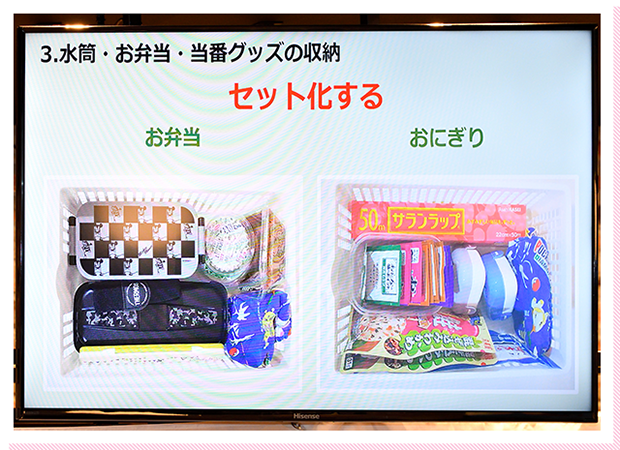 スポーツキッズに欠かせない水筒やお弁当グッズ、また当番で預からなければいけないアイテム収納のコツも教えていただきました。水筒の収納は、水筒コーナーを確保し、蓋とパッキンはセットにするのがポイントだそう。