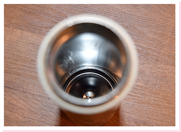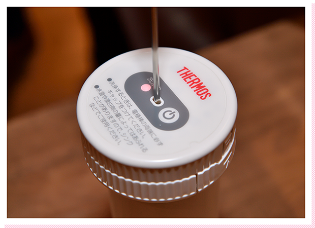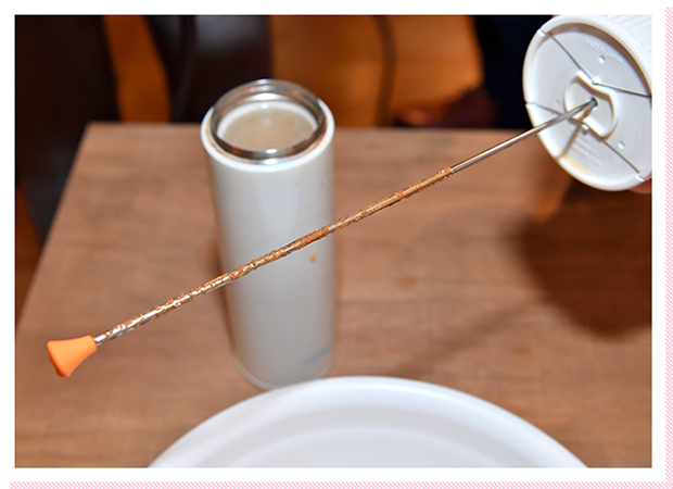 サーモススタッフが、マイボトル洗浄器を使った実演も行いました。ボトルの中に酸素系漂白剤を入れて、水を注ぎ、洗浄器のスイッチをオン。
