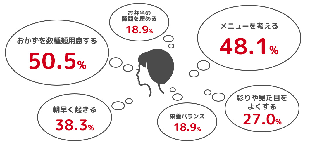 おかずを数種類用意する 50.5% メニューを考える 48.1% 朝早く起きる 38.3% 彩りや見た目をよくする 27.0% お弁当の隙間を埋める 18.9% 栄養バランス 18.6% 食材の傷み 18.3%