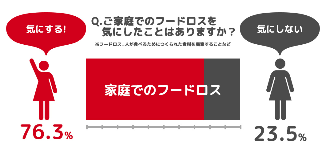 「家庭でのフードロス」を気にしたことがあると答えた人は全体で76.3%。その中でも80%以上の女性が「もったいないという罪悪感」が理由であると答えており、多くの人が食材を捨てることに抵抗があることが分かりました。