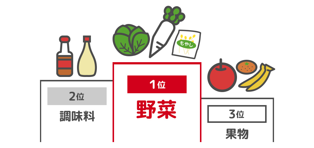1位 野菜 2位 調味料 3位 果物 4位 乾物類 5位 加工品