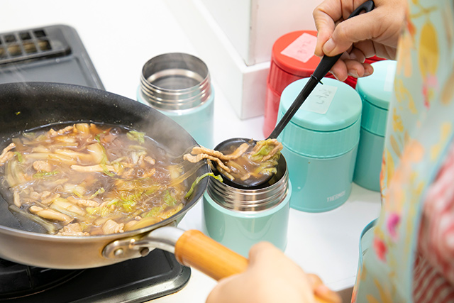 当日は「白菜と豚肉の春雨のうま煮」を実際にみなさんで調理して美味しくいただきました。さっと煮込んでスープジャーに入れるだけなので、調理はとても簡単。