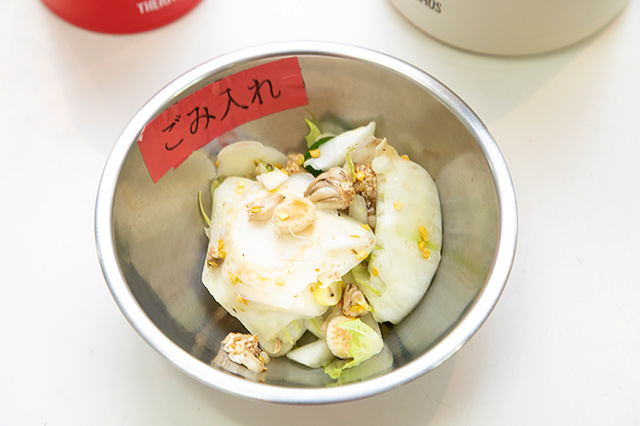 気になる生ゴミの量は……参加者の皆さんと一緒に調理した「白菜と豚肉の春雨うま煮」と試食用に準備した「エスニックおでん」と「和風ポトフ」計3品を参加人数調理して出た生ごみはわずかにこれだけ。参加者からもこれには驚きの声があがっていました。