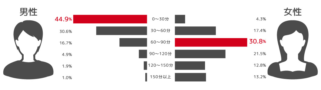 具体的に男性、女性それぞれ「平日の家事の時間」を聞いたところ、男性で最も多かったのは「0分以上30分未満」。一方女性は「60分以上90分未満」の回答率が高く、男性よりも女性が家事を行っていました。
