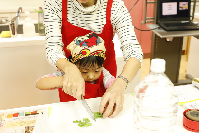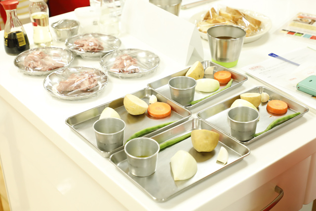 調理実習では、滝村さん考案のスープジャーを使った『つゆだく肉じゃが』を作りました。まずは先生がデモンストレーションを行い、包丁の使い方、作業の段取り、調理場の整え方などを丁寧に解説。お母さんと一緒に参加した小6の女の子は「久しぶりに包丁を持ったから大丈夫かなって不安でしたが、滝村先生が包丁の持ちかたをわかりやすく説明してくれたので、上手に切れました」とうれしそうに話してくれました。