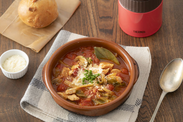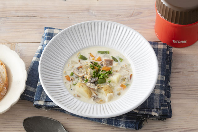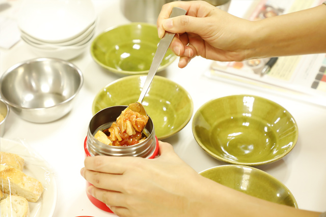 また、滝村先生考案の「鶏むね肉のトマト煮スープ」と野上先生考案の「ニューイングランドクラムチャウダー」の試食も行われました。「鶏むね肉のトマト煮スープ」にはバゲットを合わせて、おしゃれなランチに。また、「ニューイングランドクラムチャウダー」は、つゆだく肉じゃがで使ったじゃがいも、にんじん、玉ねぎを使って作れるアレンジレシピ。参加者たちは、「こんな立派な一品料理がスープジャーで作れるなんて!」と感動しきりでした。