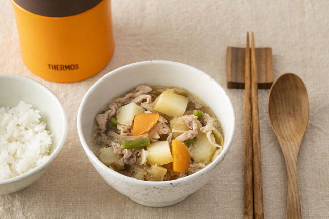 「スープジャーなら保温調理ができるから、忙しい朝にもお鍋でさっと煮込むだけで、長時間加熱する必要はありません。ランチタイムには具材の中まで味がしみ込んだおいしい肉じゃがが完成。最初にスープジャーに熱湯を入れて、予熱するのがポイントですね」